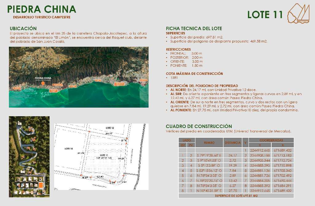 PIEDRA CHINA! 26 exclusive lots with PANORAMIC views of Lake Chapala and Cerro de García, a safe and peaceful community in the upper part of the El Limón subdivision. Located 4.2 kilometers from the Racquet Club, it offers the privacy of a condominium with the convenience of being just 375 meters from the town of San Juan Cosalá. Features include a gated entrance with 24-hour security, landscaped areas, concrete roads (18 and 15 cm thick), walkways throughout the development, a clubhouse with a social area, full restrooms, a pickleball court, a children's playground, and wooded common areas. Take advantage of this unique opportunity in a high-value area and invest in your future today! Financing is available for 12 to 24 months.