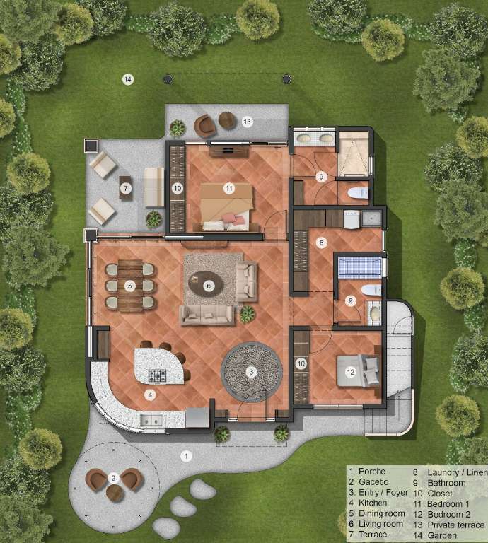 - Integrated living, dining, and terrace areas with handcrafted brick vaulted ceilings