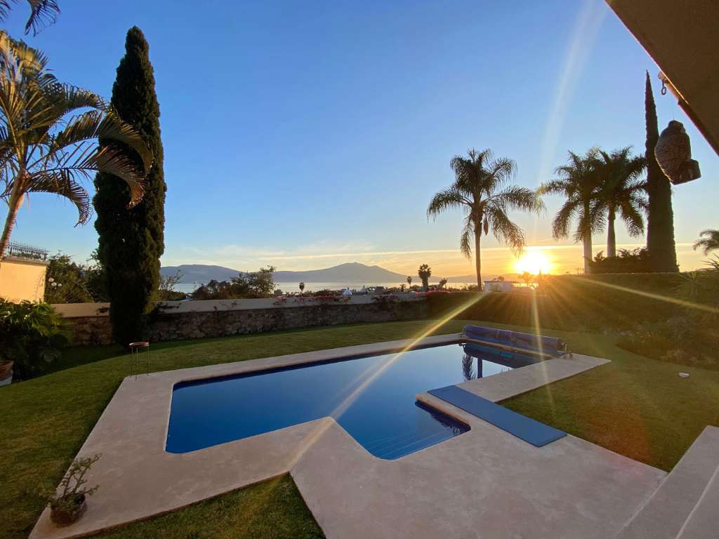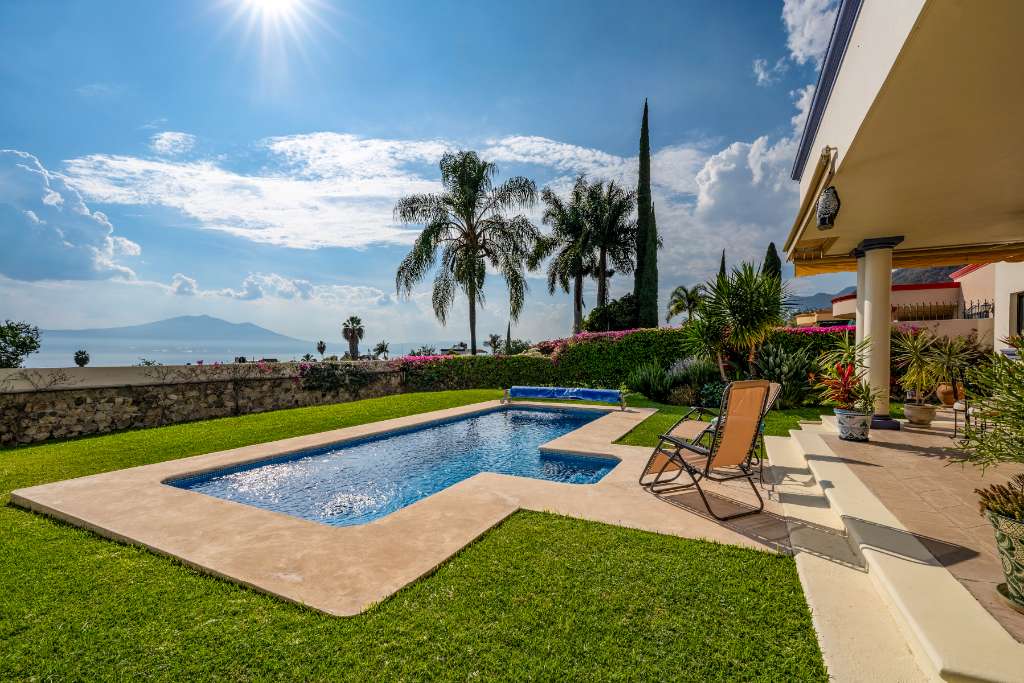 Una terraza cubierta junto a la piscina con vistas al lago ofrece el lugar perfecto para disfrutar del reconocido clima de Ajijic, brindando un ambiente apacible y una experiencia de vida más sofisticada.