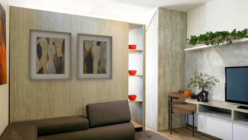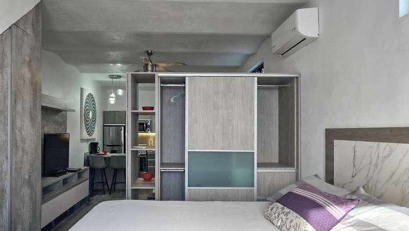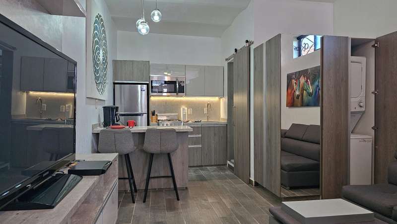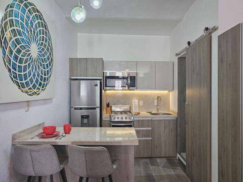 The duplex consists of two "tiny house" type units, with the lower level akin to a hotel junior suite or studio, and the upper level designed as a charming one-bedroom apartment. Each unit has a complete kitchen, and a private entrance, making them ideal for comfortable living.