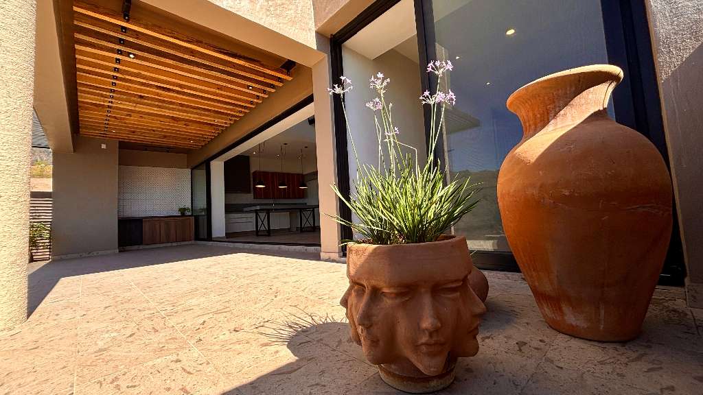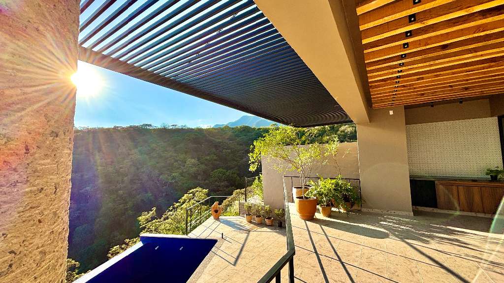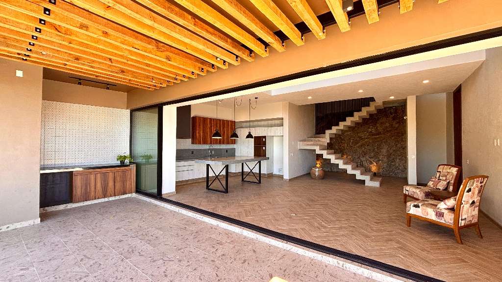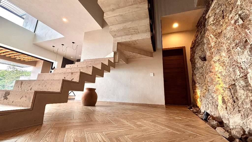 Luxury finishes enhance the architecture: a natural stone wall from the mountain adds character and authenticity, while wood, granite, and cantera elements in earthy tones envelop each space in a warm and sophisticated atmosphere.