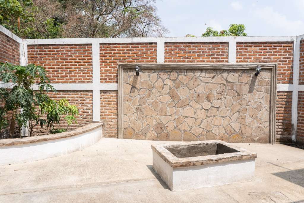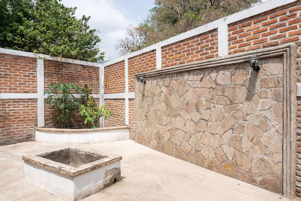 * Private Backyard Oasis: Stone patio with *fire pit, landscaped gardens, and artisan *cantera detailing – perfect for outdoor living.