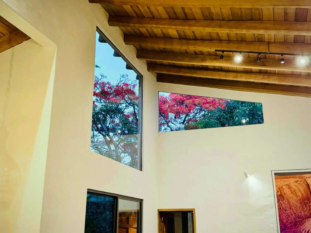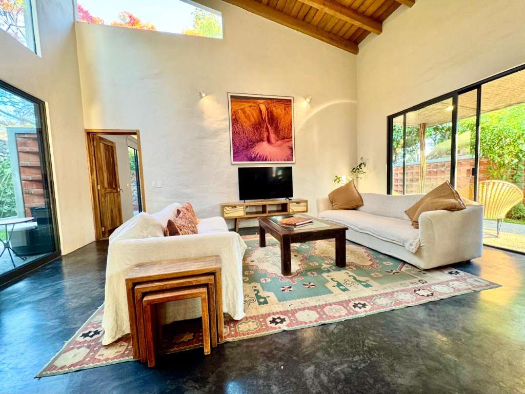 The social area boasts double-height ceilings and strategically placed windows that offer lush green views from every angle of the home. The vibrant presence of a large flowering tabachĂn tree, the surrounding mountain, and abundant vegetation create a serene and inspiring atmosphere.