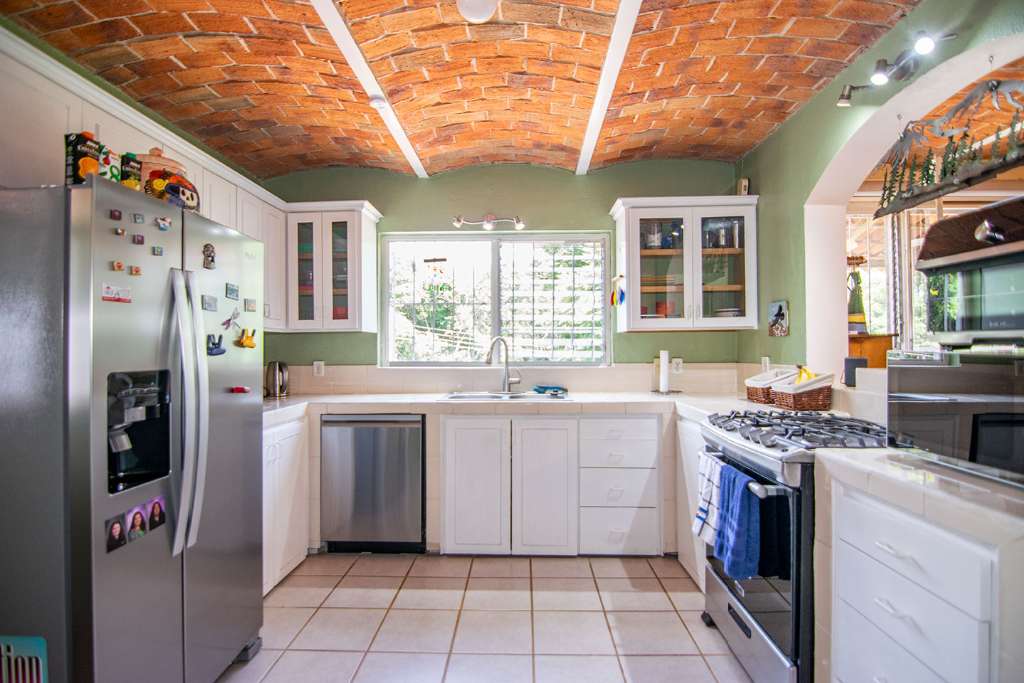 Junto a la sala principal se encuentra la amplia cocina. Cualquier diseñador reconocerá y apreciará de inmediato el diseño triangular ideal, con el fregadero al centro y el refrigerador y la estufa a los lados. Este diseño, combinado con una abundante cantidad de gabinetes y superficie de trabajo, hace que preparar alimentos sea un placer.
