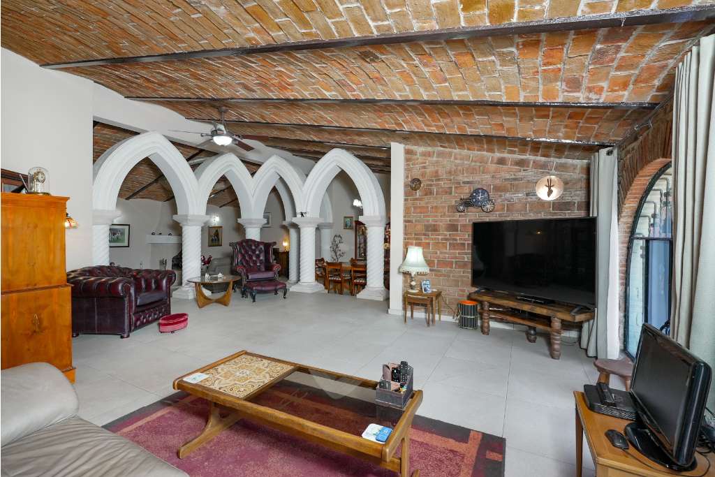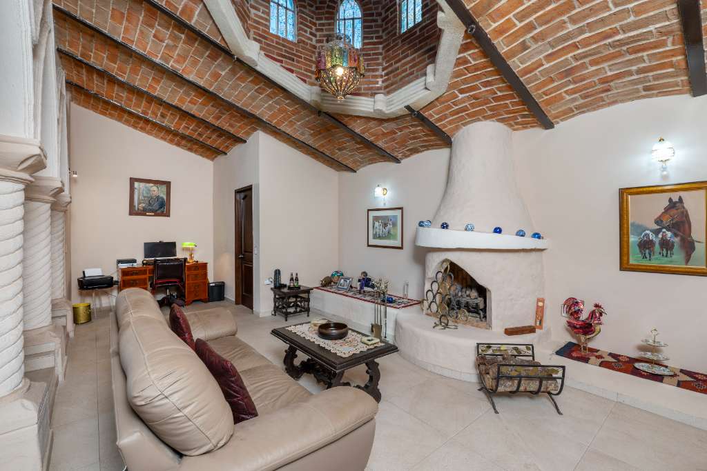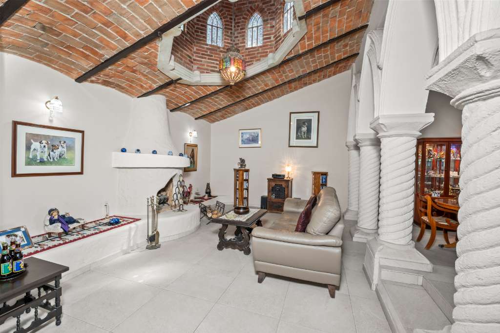 Living Area: The dining room and main living room are framed by a series of uniquely styled arches that lend distinction and warmth. An elegant fireplace serves as the focal point of the space, creating the perfect atmosphere for enjoying cool evenings in an intimate setting.