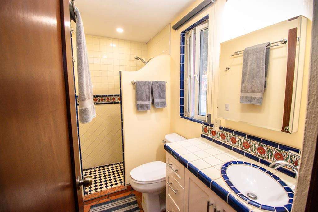 Located near the guest bedroom and dining room, this full bathroom features traditional Mexican tile and a walk-in shower.