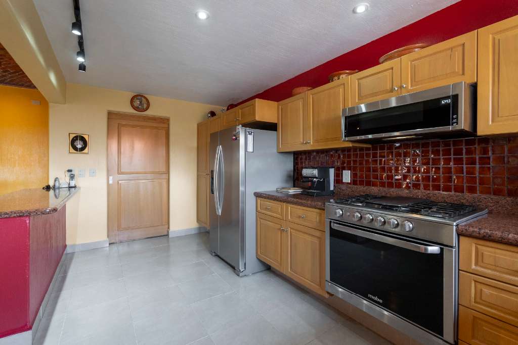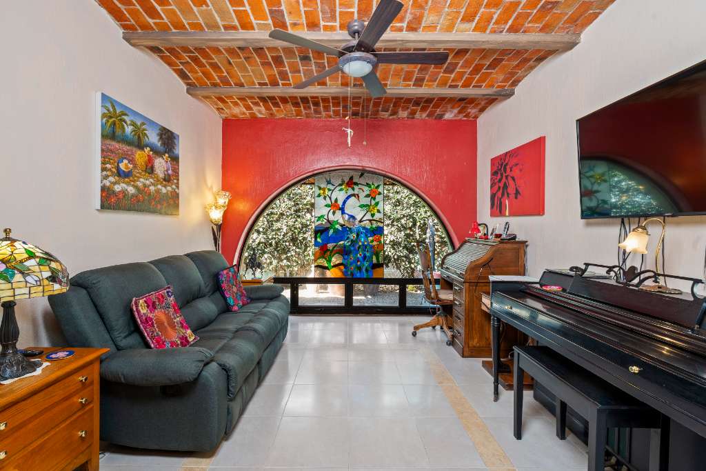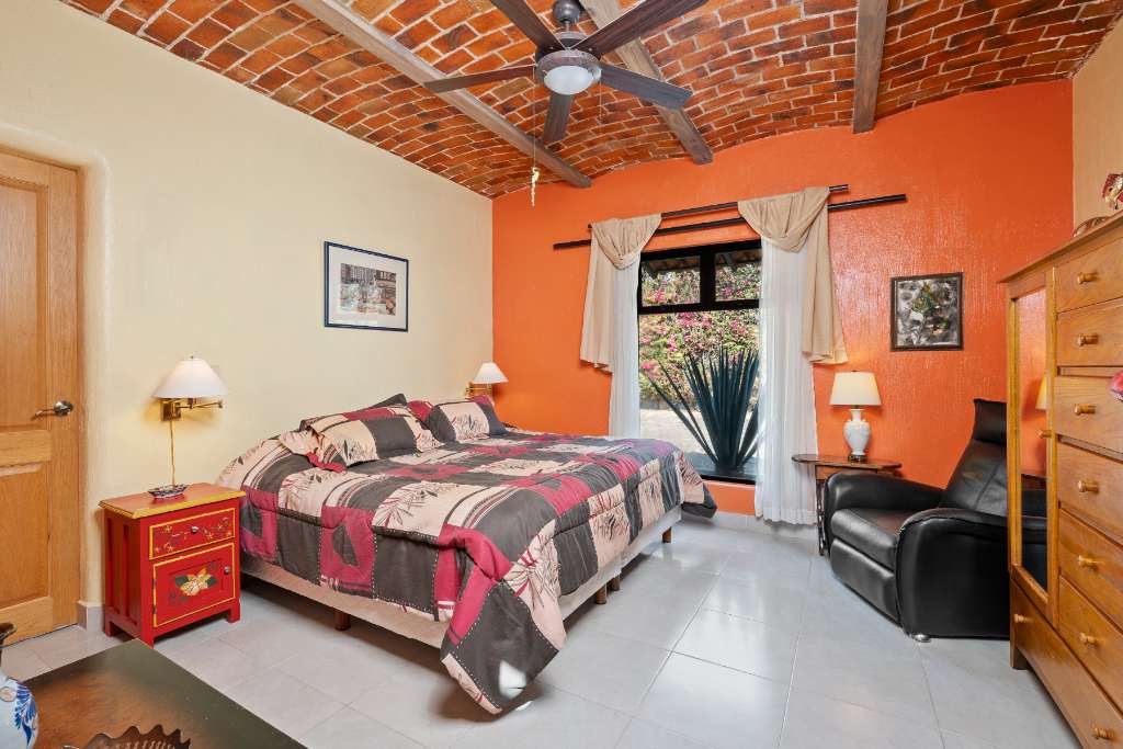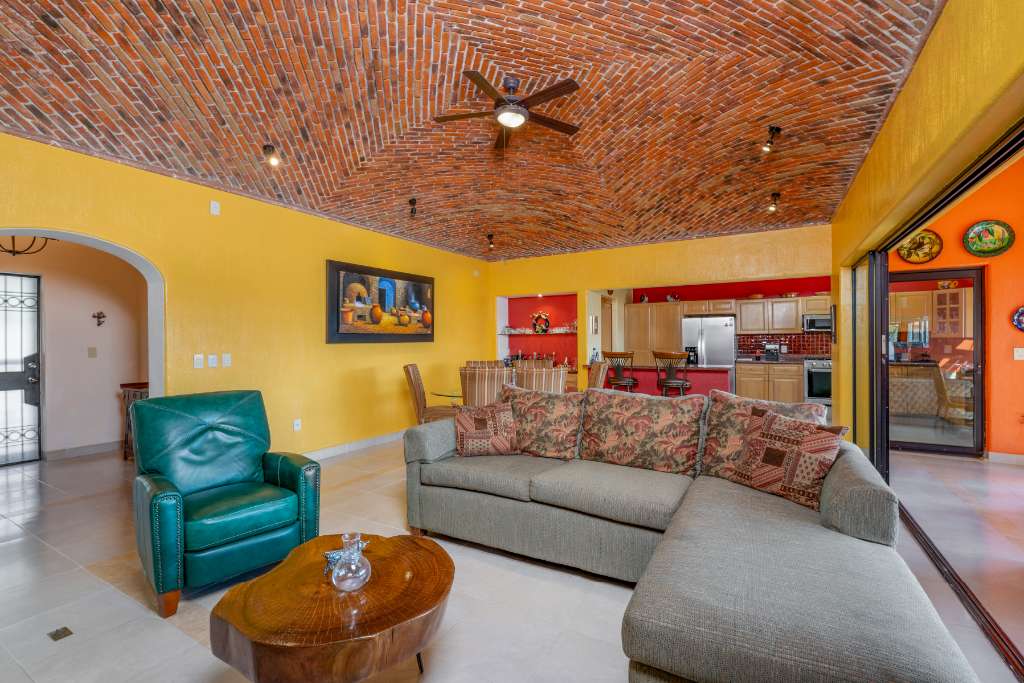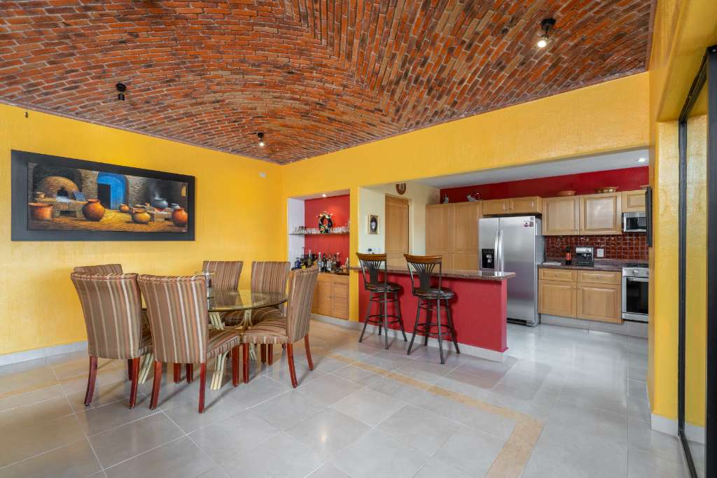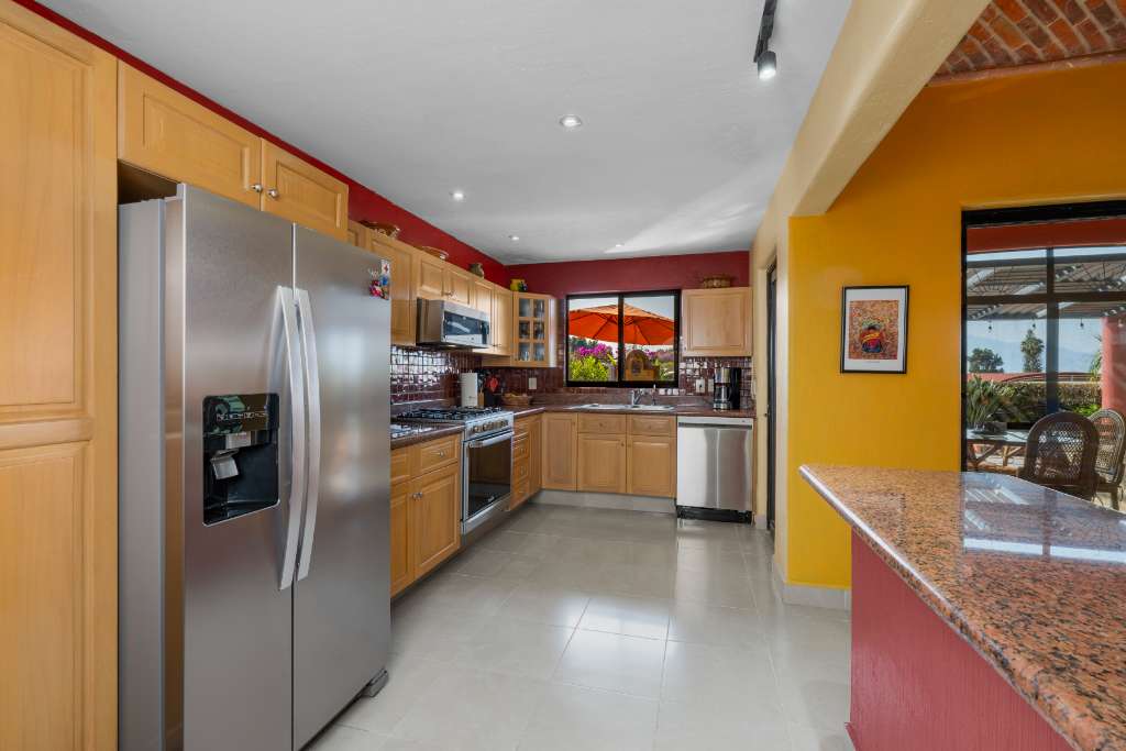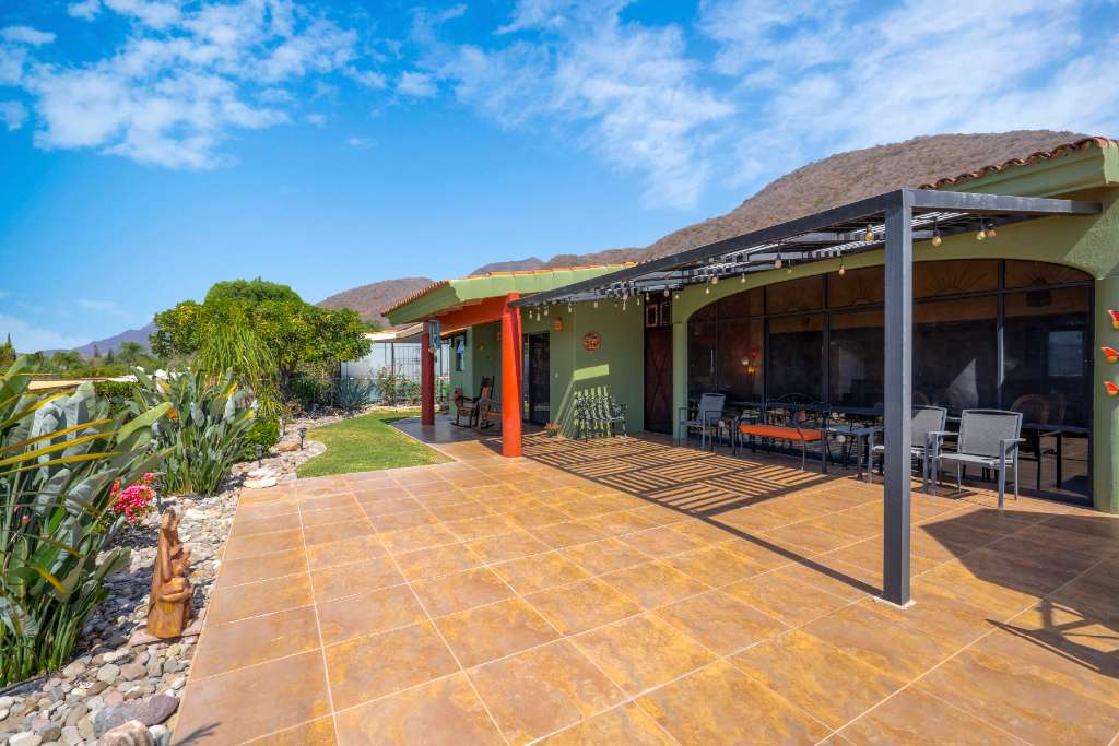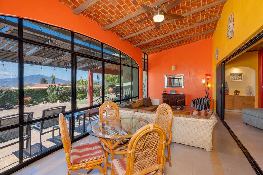 As you pass through the front foyer, you are welcomed to a large open space with a striking brick boveda ceiling. The kitchen, dining and living areas are all connected. There is a fireplace with a gas insert for the chilly winter evenings... The living space extends out into a large fully screened outdoor terrace allowing for year round enjoyment of the climate without any insects! From this main level there is a partial lake view and a view of the mountains.