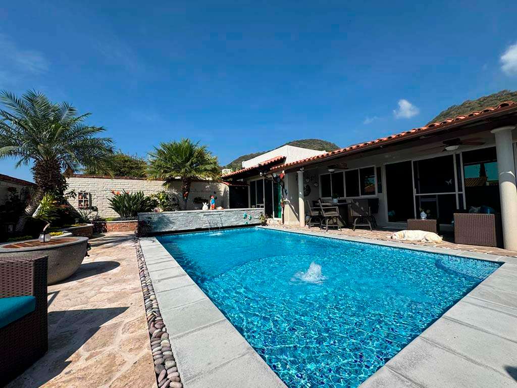 The garden includes two planter beds and two firepits – one poolside and one under the covered terrace. With an open concept floorplan, the family room is situated next to the fully equipped kitchen for viewing TV. The house is a showcase for entertainment with its spacious seating areas and wet bar, wine fridge and plenty of storage. You will be ready to rock & roll! The house is partially furnished and includes all appliances.