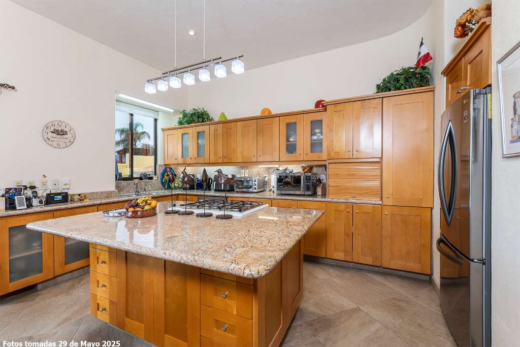 - The kitchen has a modern vibe with an oversized island lit by a bar of crystal lights and a FIVE burner cook top stove. The double sink offers a garden view and a pass through to the outside grilling kitchen. Stainless steel appliances contrast with blonde wood cabinets many with contemporary frosted glass fronts. Pantry storage, appliance garage, granite countertops, full height back splash, undercounter lighting, cabinet crown molding and space above the cabinets for art and pottery.
