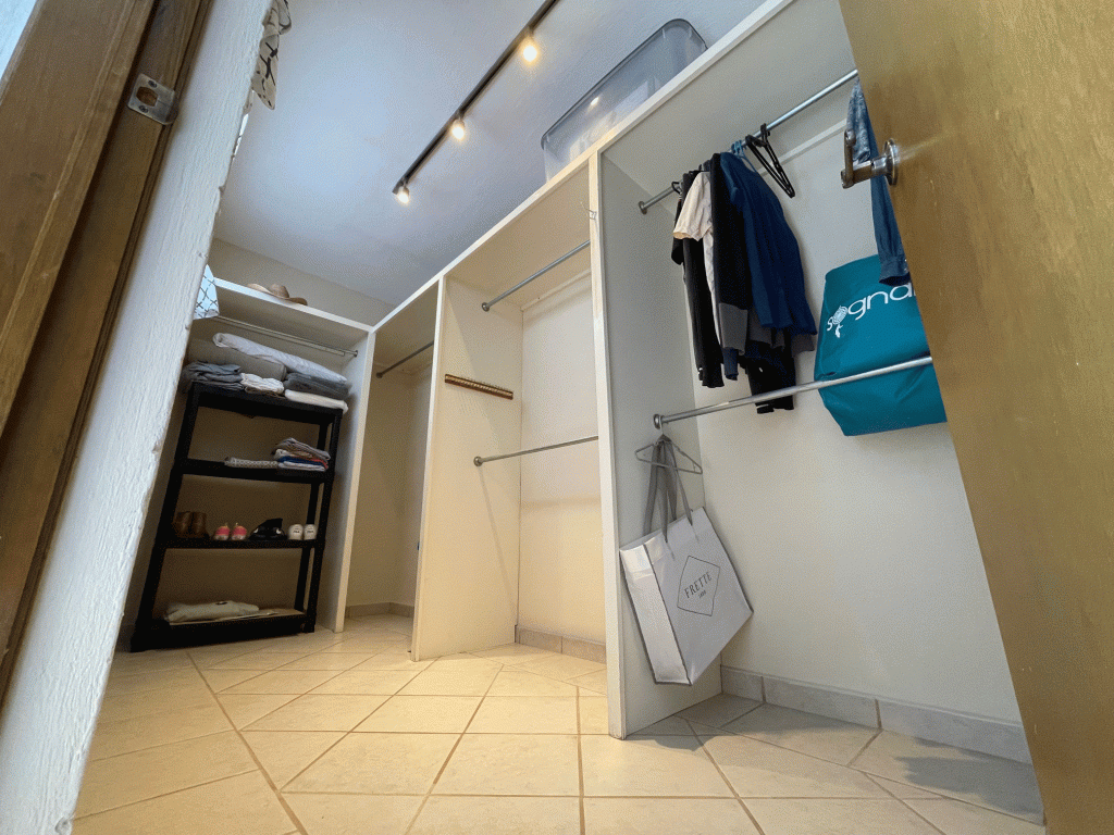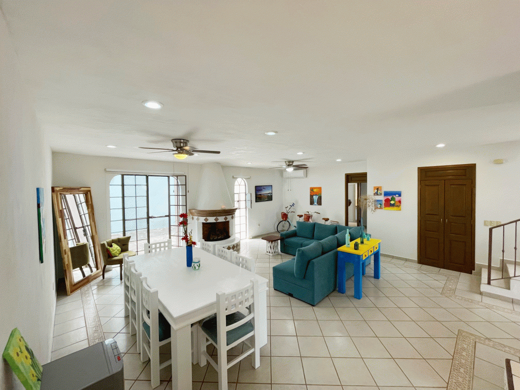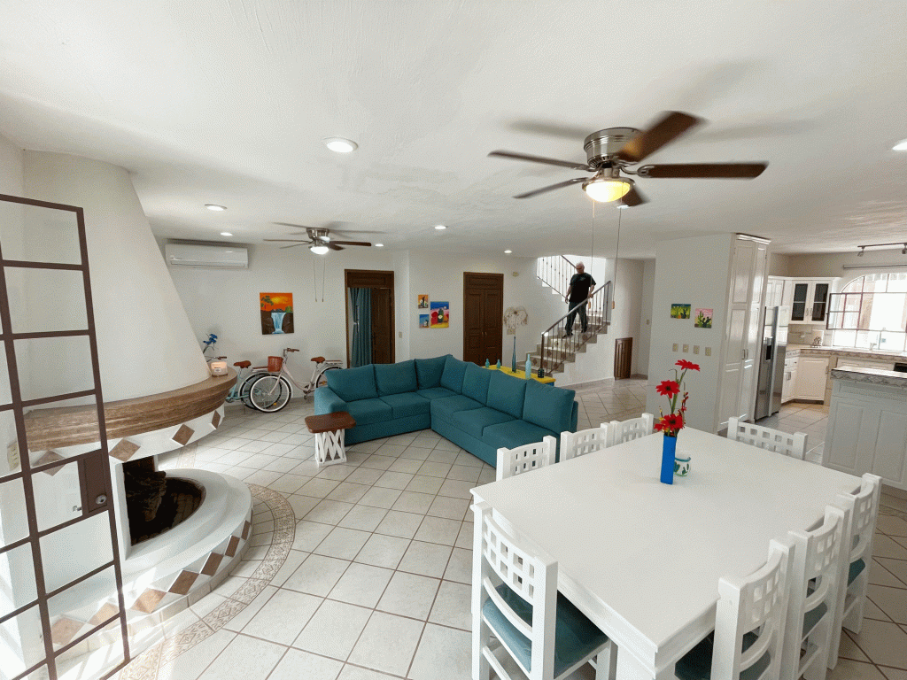 On the upper level, there is an additional spacious living area and a balcony facing the front of the property. The house offers abundant natural light, high ceilings, and open spaces. Air conditioning units are installed on all floors, ensuring year-round comfort.