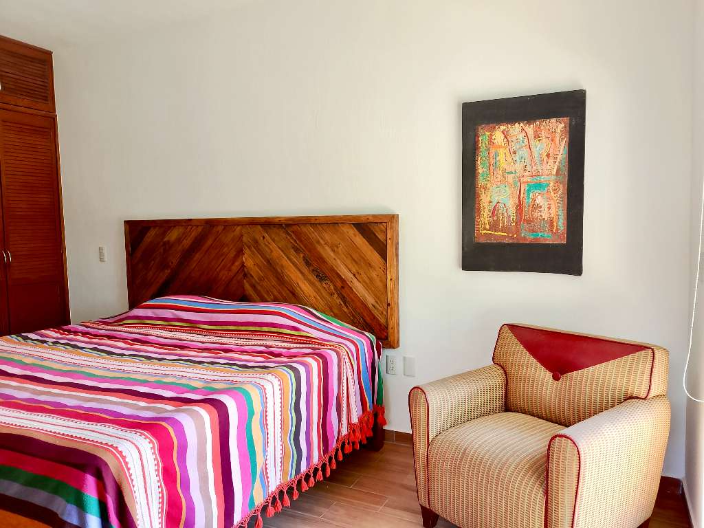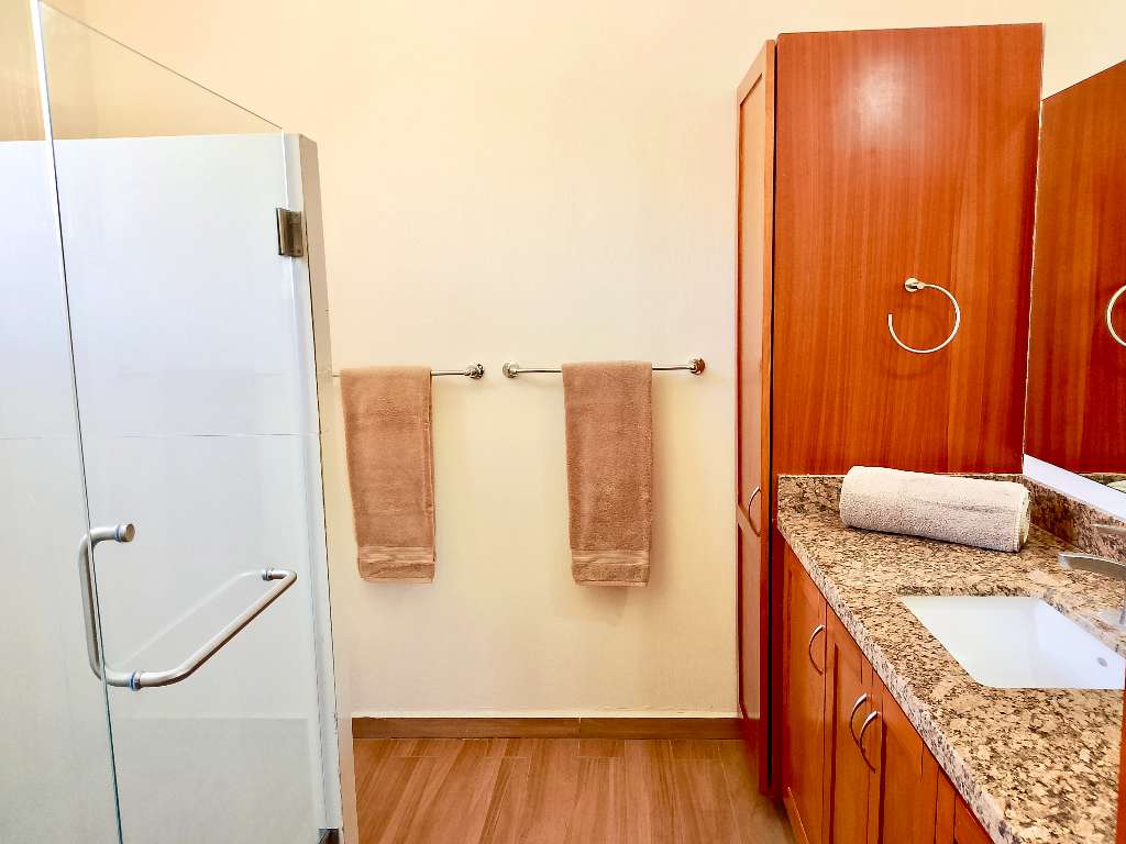It features two spacious bedrooms with top-quality wood closets. The master bedroom is on the upper floor, complete with its own bathroom and a lovely balcony overlooking the stunning Chula Vista mountains and the garden terrace.