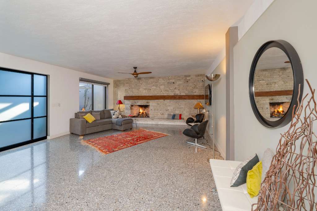 - Open-concept lounge living room anchored by a long stone fireplace — a sculptural