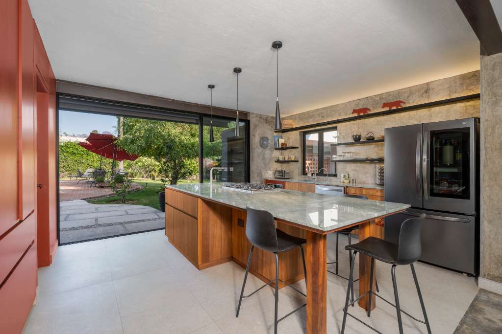 - Entertainer’s kitchen featuring natural materials, generous prep space, and views of the