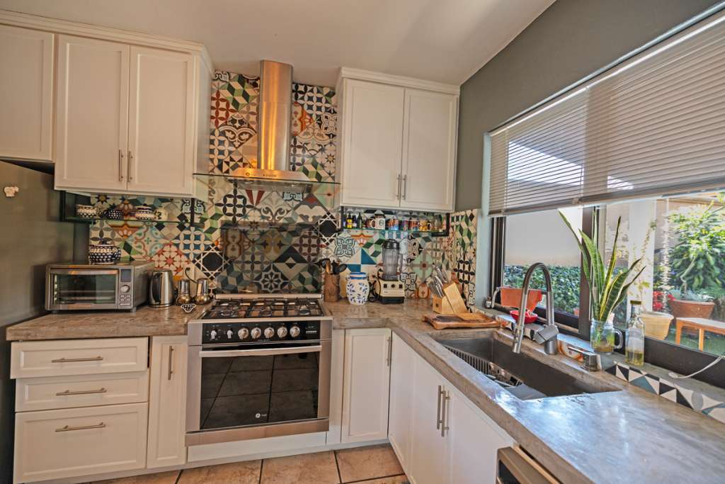 A nice size kitchen with polished concrete countertops and a funky bohemian tile backsplash adds so much zip to the crisp white cabinetry!