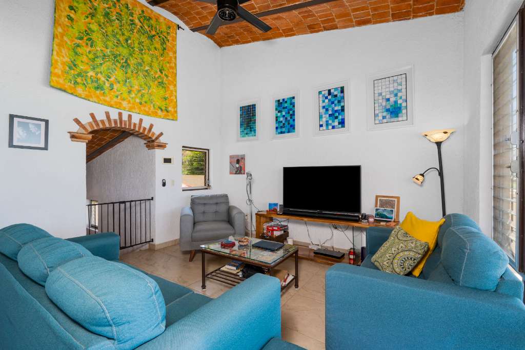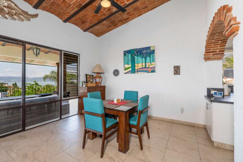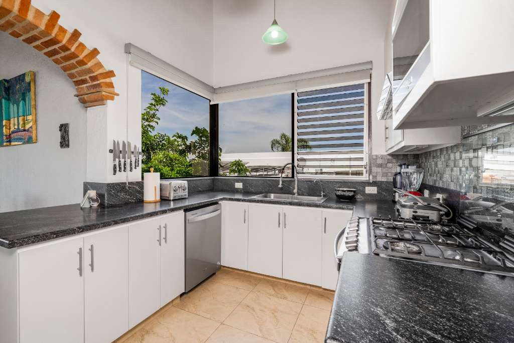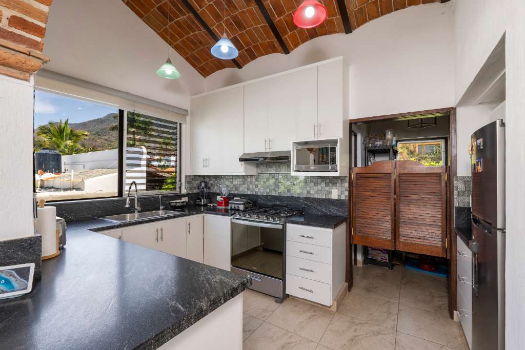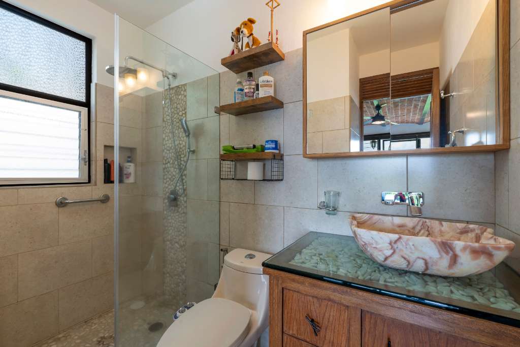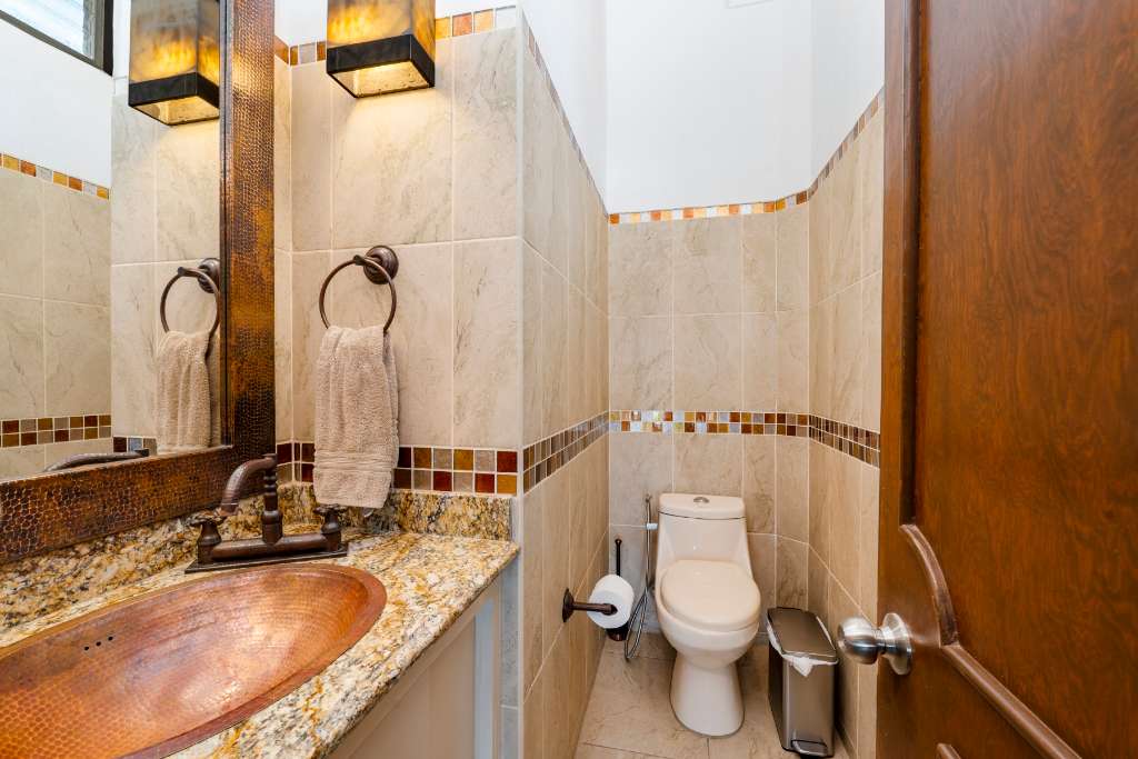 The upper level of your house has the best views! The open concept focuses on the huge covered terrace where you will spend most of your time admiring the beauty around you and enjoying the soothing breezes and the amazing sunsets. The functional kitchen has lots of counter space, granite counters, and stainless steel appliances. There is an extended pantry area as well. From there you can interact easily with the dining and living areas, and the terrace. There is a half bath with copper sink and mirror.