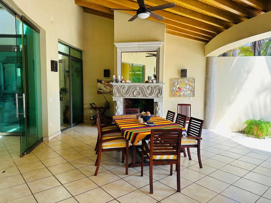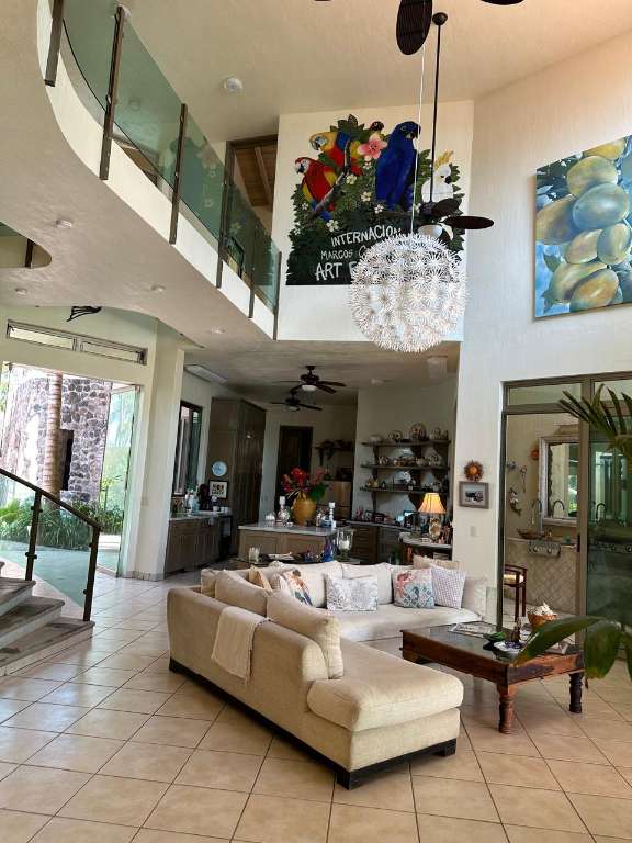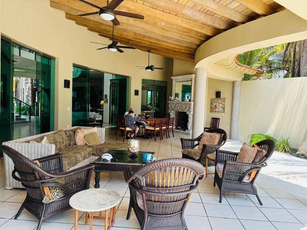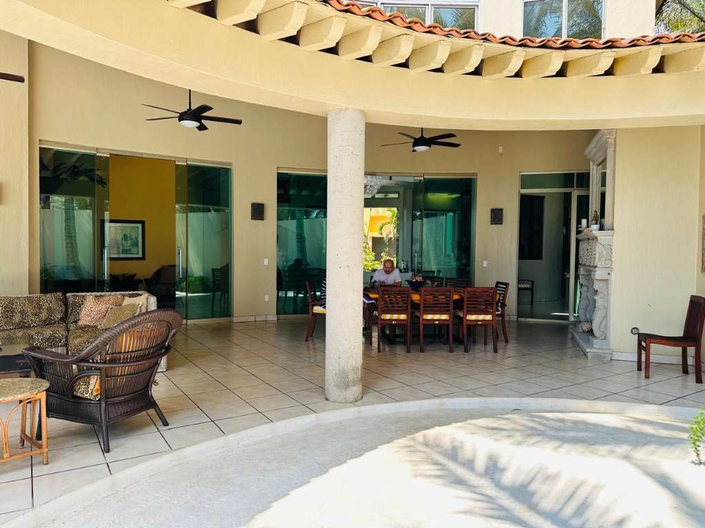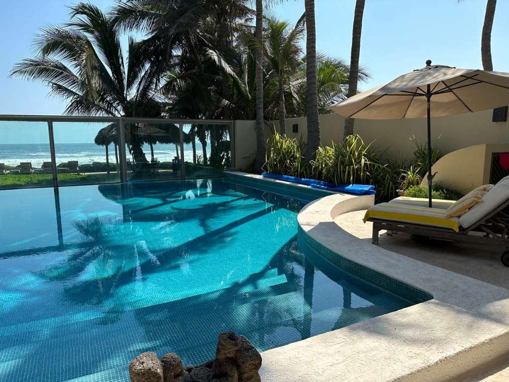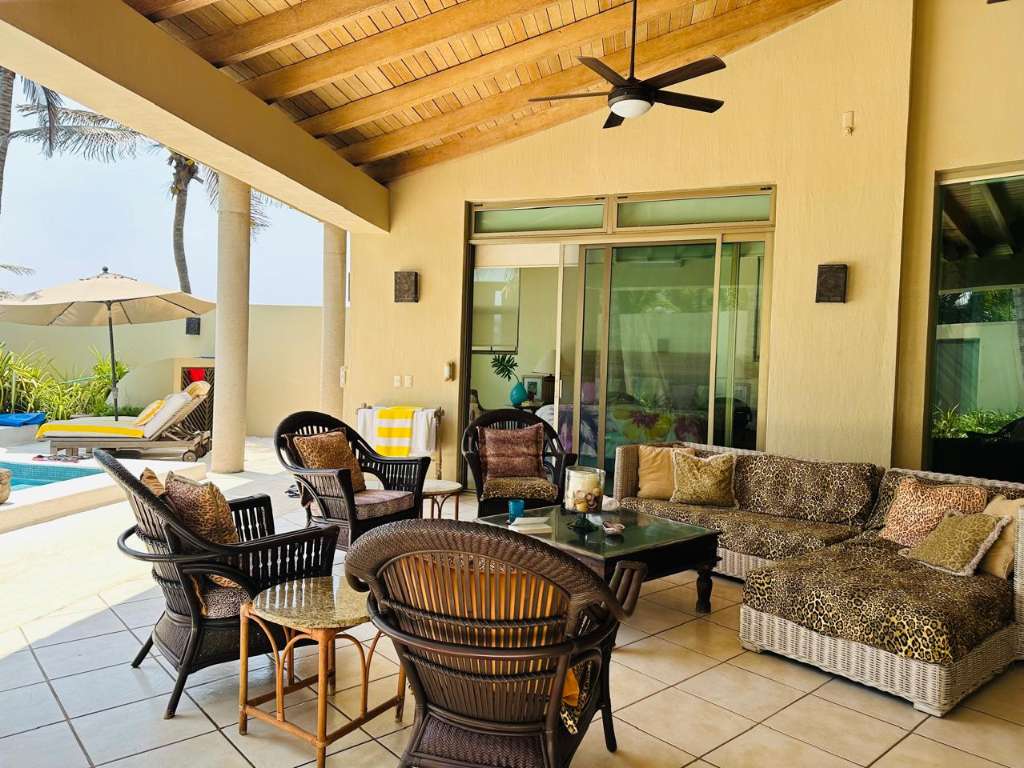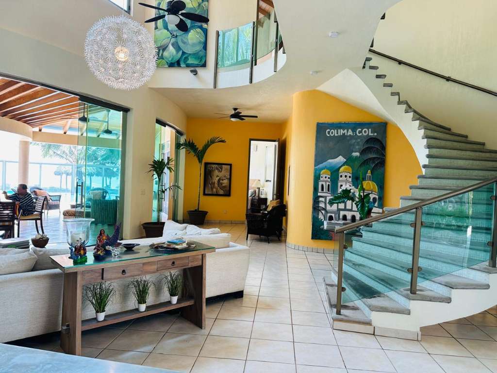 5 Bed 6 bath. Relax year round sun & sand spectacular spacious designer move in family vacation home 1hr. South of Manzanillo/ 3 hr easy toll road drive from Ajijic & Guadalajara, enter tropical garden flow under your carved cantera stone mermaid. Main floor soaring ceilings. View thru to ocean your own private pool grand covered terrace out to palapa for sunset margaritas. Live indoor/but all year long. Spacious open plan great room. Chef kitchen with BBQ atrium. Master suite & Guest suite. Flow up circular stairway to 2 guest suites with terraces & gigantic master suite view to ocean, whale watch, nature lovers paradise sea turtle reserve. It's a Mexican beach resort village. Local charming fish restaurants your feet in the sand 1 hr to Manzanillo or 1 hr to Colima for local culture. House has excelent staff, maid & house man for easy maintenance. Show by appointment.