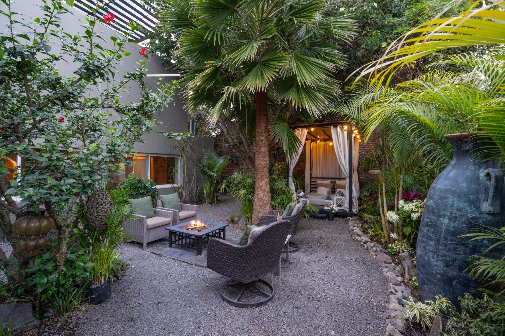 Lush garden with Balinese style bed with fire pit