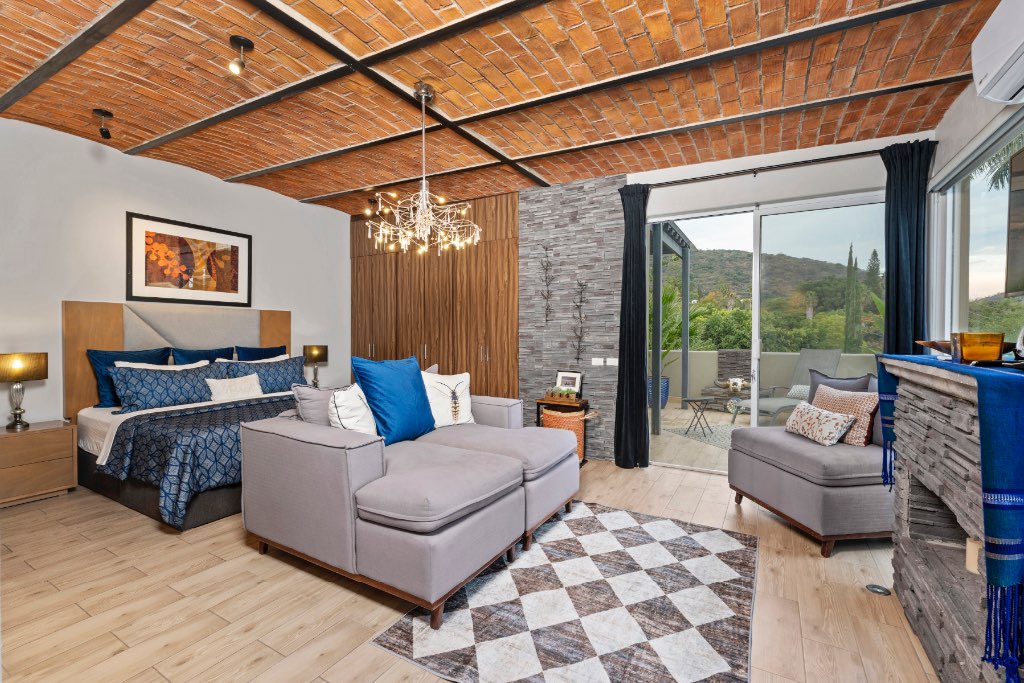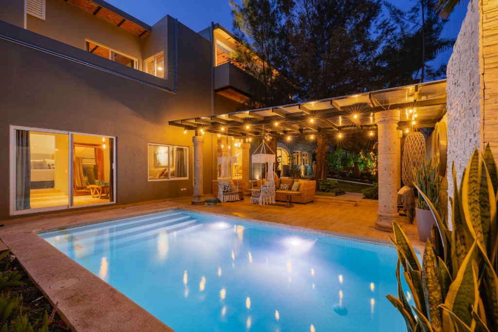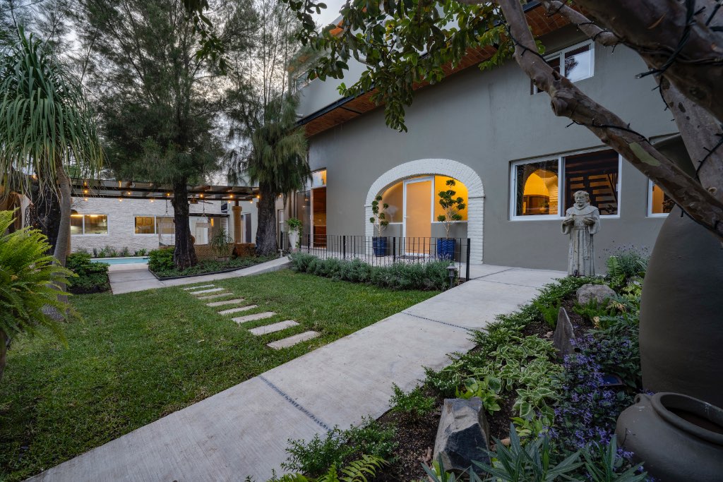 Imagine your own private sanctuary, situated only 29 kilometers from the Guadalajara International Airport—this exceptional 4-bedroom, 5-bathroom estate blends modern design with warm Mexican architectural charm, set within a 16-foot privacy wall that creates a true sense of escape in a peaceful, tree-lined neighborhood. From resort-style amenities to thoughtful upgrades, this home is designed for comfort, sustainability, and flexibility, making it ideal for multi-generational living, boutique rentals, or a luxury retreat.
