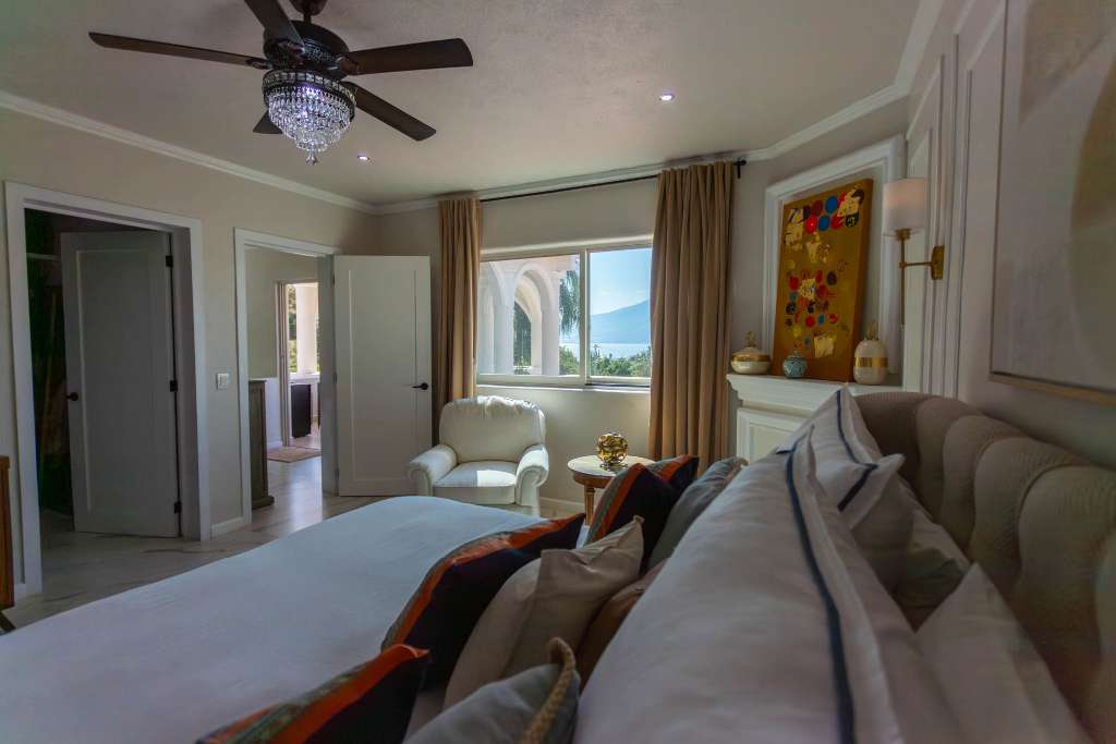 The primary suite on the ground floor features a walk in closet full bathroom and private terrace with views of the lake garden and pool. A second bedroom is also located on the ground floor while the third bedroom on the upper level offers its own walk in closet bathroom and terrace with views of the lake and surrounding mountains