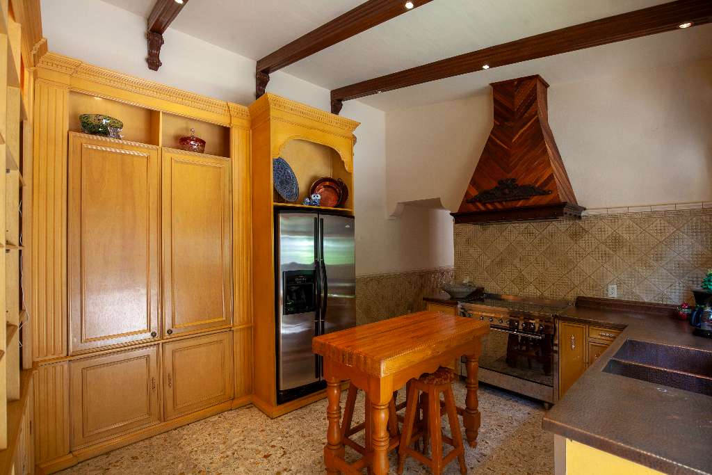Gourmet kitchen features modern appliances, beamed ceilings, copper sink and counter and a generous pantry.