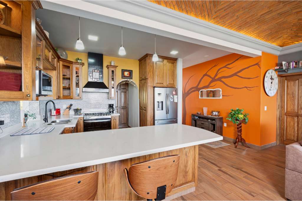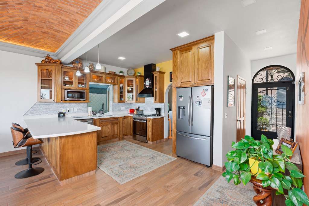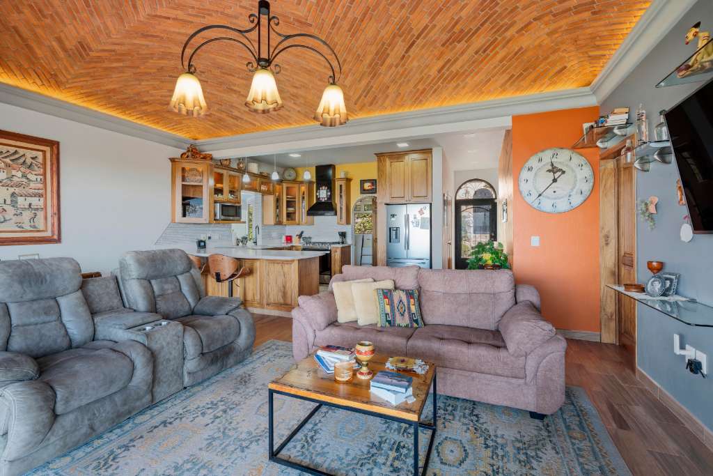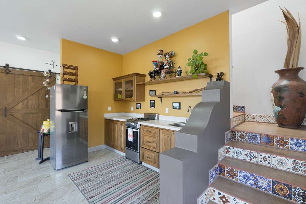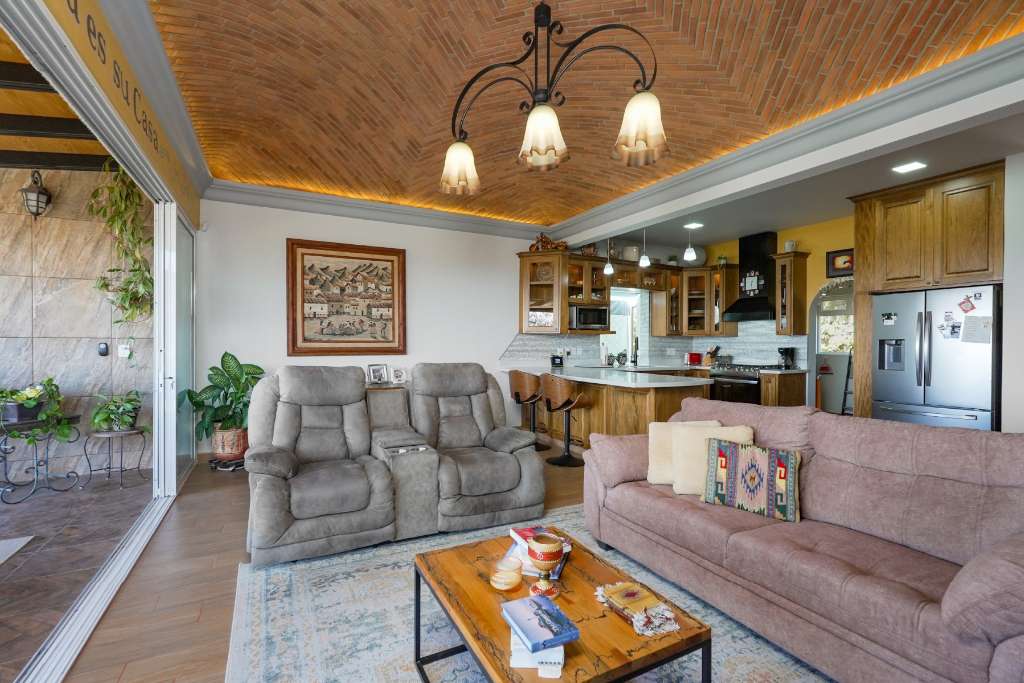 Walk in to the main level and you are greeted with a wide view of the lake. Open concept great room with a generous sized kitchen with pantry space and a huge bar. The living room, with a towering arched boveda brick ceiling, connects right to the large covered terrace where you will surely spend much of your time and eat most of your meals while you enjoy the cooling breezes while working the BBQ. There is a powder room for your guests.
