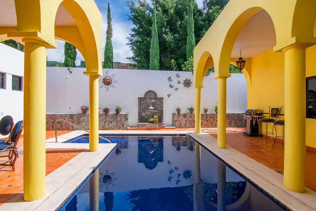 The back terrace is situated around a gas & solar-heated swimming pool. The terrace is a great place to entertain your friends and have a cookout. Or you can escape to your private oasis and listen to the wall fountain.