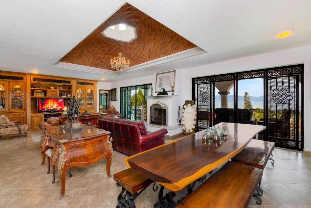 The expansive backyard is designed for relaxation and gatherings, offering a saltwater pool, Jacuzzi, hot tub, extensive patios, BBQ area, and mature gardens. Panoramic lake views and refreshing breezes can be enjoyed from nearly every room, with architectural design thoughtfully oriented to showcase the water.