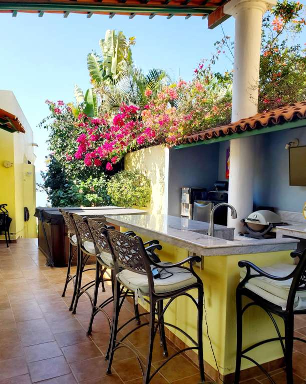 The 2 levels of construction yields a full blown 2 bedroom casita with 2 baths, a complete kitchen, and living room downstairs. Above is the main home with balconies galore, 2 good size bedrooms with ensuite baths, open floor plan living room, chef’s ”dream kitchen”, solarium, and office/bodega. Outside…well…you cant go wrong! Its so inviting to lounge in the bar area next to the heated pool. Everything you need…. fridge, tv, sound system, marble top bar, sink, full bath, an abundance of covered seating, and a ready to go Jacuzzi!