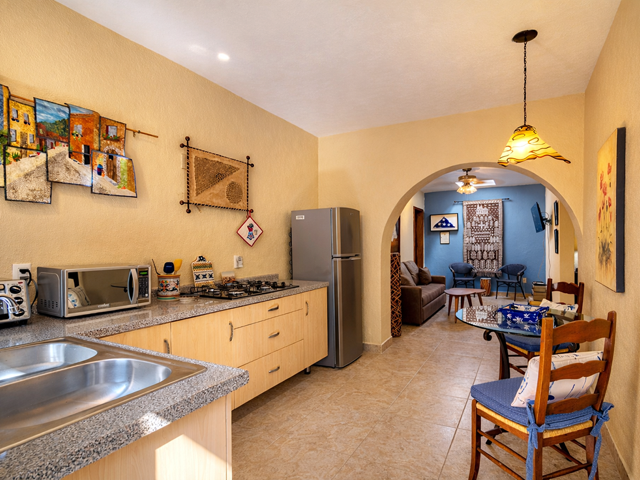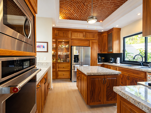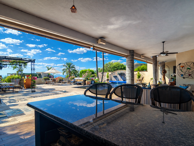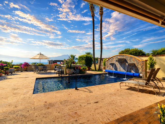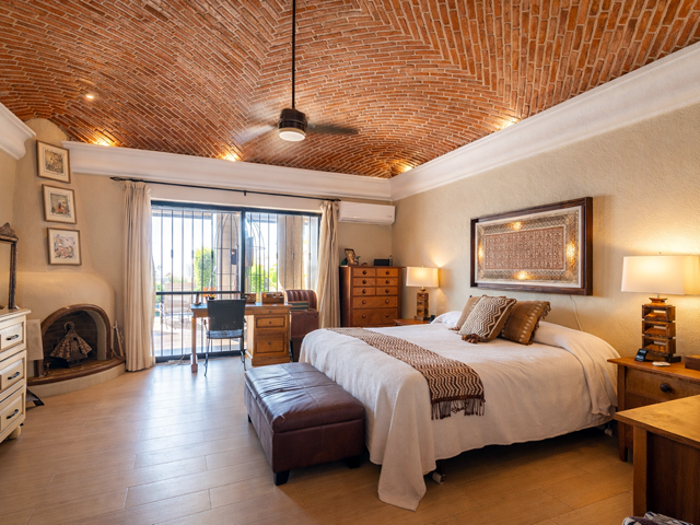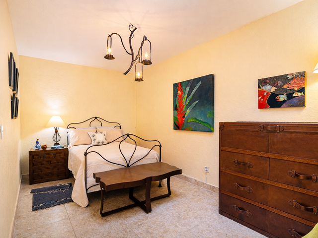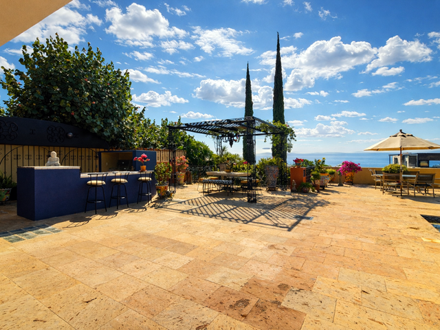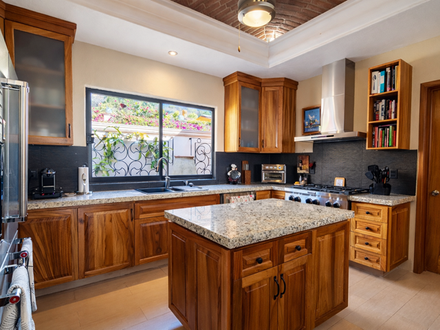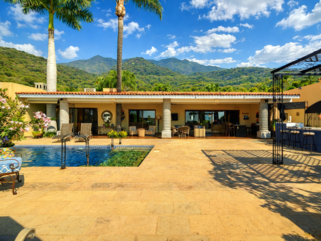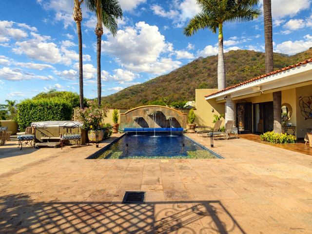 This mountainside estate is in western Ajijic in a prestigious gated community called “Los Arroyos Sur” and has a one-story floor plan with loads of Mexican charm. The home was built on an extra-large lot that has the main house entry from the top street and a totally separate 700 square foot guest house that contains 2 bathrooms and could sleep 4 people with a full separate kitchen. No expense was spared in the remodel of this large home, a custom-built exotic wood kitchen, all top end professional stainless appliances, a beautiful back lit curio cabinet and to top it all off expansive use of elegant granite. Large Mexican brick cupolas ceilings are use throughout; custom designed stained-glass skylights, loads of natural Cantera stone decking was used to set off that solar heated pool. Main house has a large master bedroom and elegant ensuite, guest bedroom with its own bathroom, family room with painted custom built-in bookshelves, half bathroom and a large covered front terrace with bar and outdoor BBQ area. Being offered with a generous furniture package and includes many extras like air conditioning in the master bedroom, a whole house backup generator, automated insect misting system, full solar electric, separate freestanding large jacuzzi and a water feature that sets off the pool. Do not miss this opportunity.