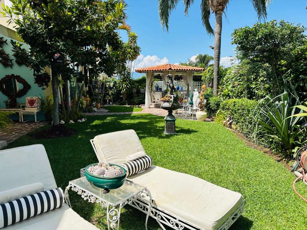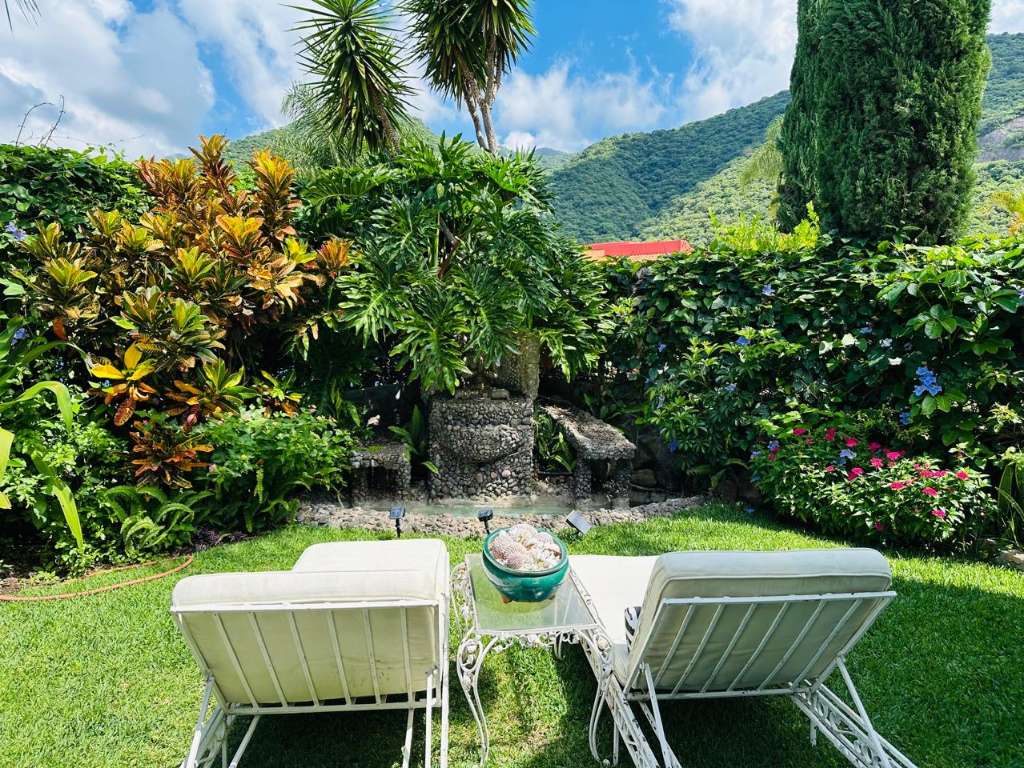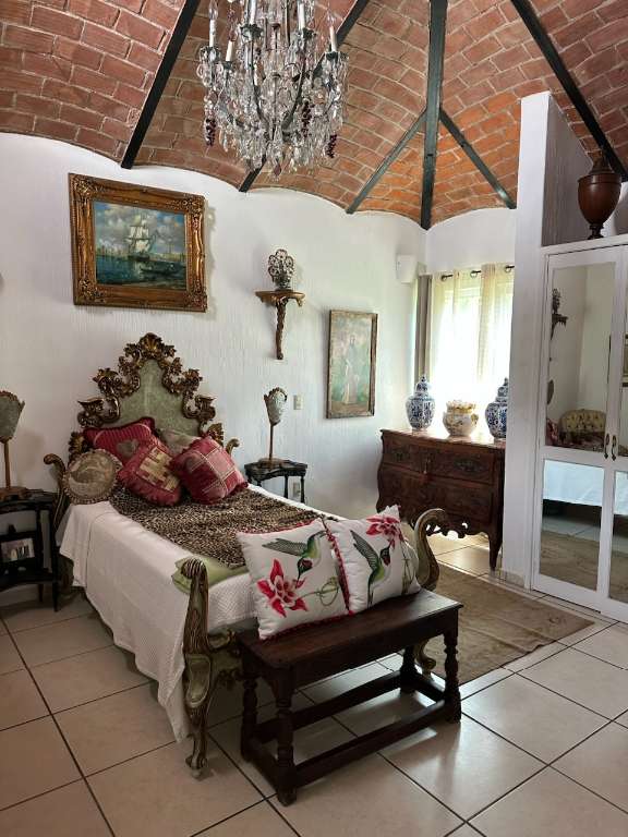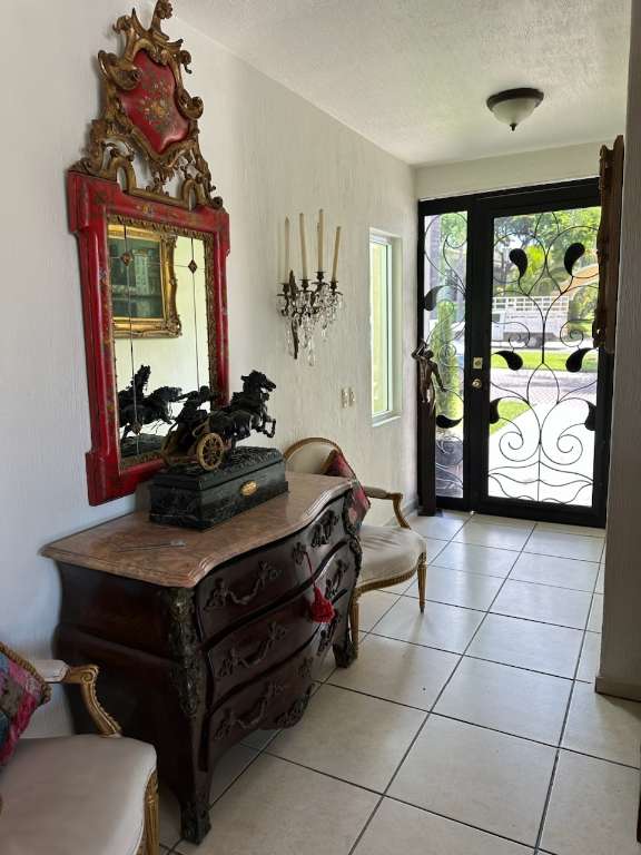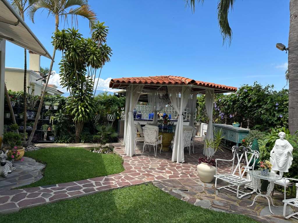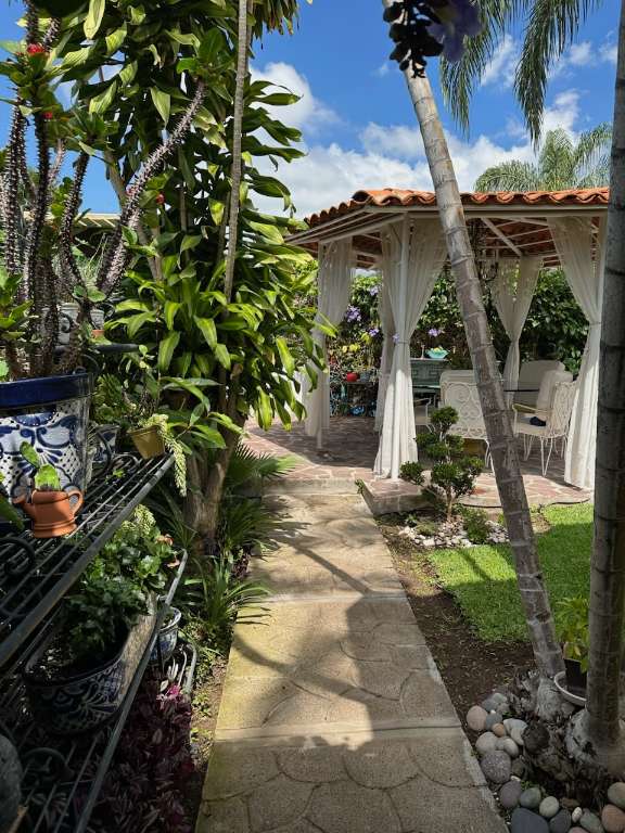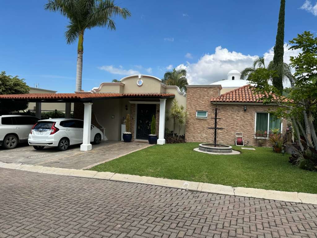 Enter foyer flow to modern chic kitchen & laundry flow thru dining huge living room. Sky high ceilings. Marble granite floors. View out to gardeners dream gardens with private gazebo. Easy entertaining all year round. Quiet sun chaise for two by romantic fountain. Main house, bedroom wing master suite with high domed ceiling bath ensuite with glam shower guest suite with ensuite bath. Third bedroom presently T.V. office with bath too! 2 car carport flow to flagstone private terrace gated community huge common pool & tennis courts & community center for your private large parties. 24/7 gate guards. Walk to Walmart, movies, restaurants. Friendly new managed community 30 mins to Guadalajara international airport. All in one level!!